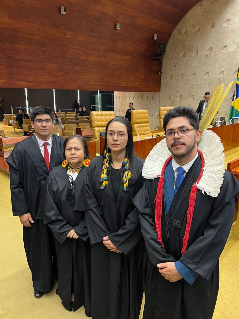 Da esquerda para a direita: Ivo Makuxi, Cris Baré (in memoriam), Kari Guajajara e Maurício Terena durante arguição oral no STF, contra o Marco Temporal.
